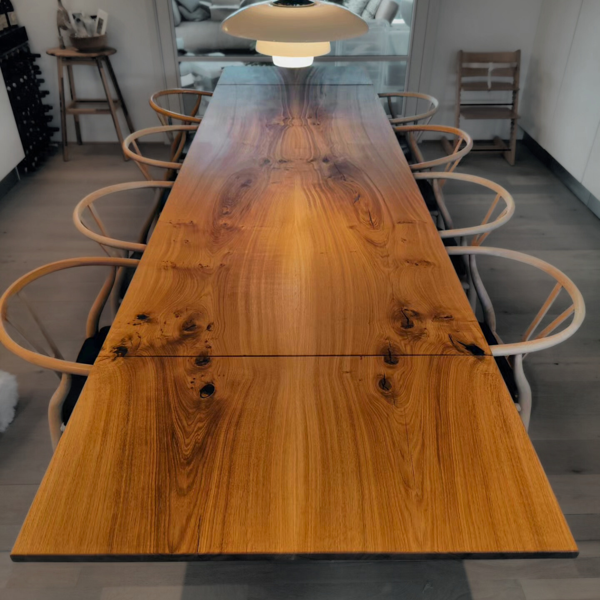 Vores signatur er at skabe borde af to spejlvendte planker. Når årene spejles, opstår der en naturlig symmetri og balance, som giver bordet et roligt, eksklusivt og tidløst udtryk. Det er denne løsning, vi næsten altid anbefaler – medmindre du som kunde ønsker et andet udtryk med flere planker.
